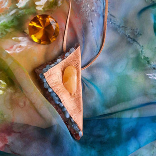 Форма получилась необычная. Четырехугольник, форму ската, я свернула, как в детстве дети сворачивает "секретики". Внутри - аквамарины и перламутр, снаружи -апельсиновый кальцит.
